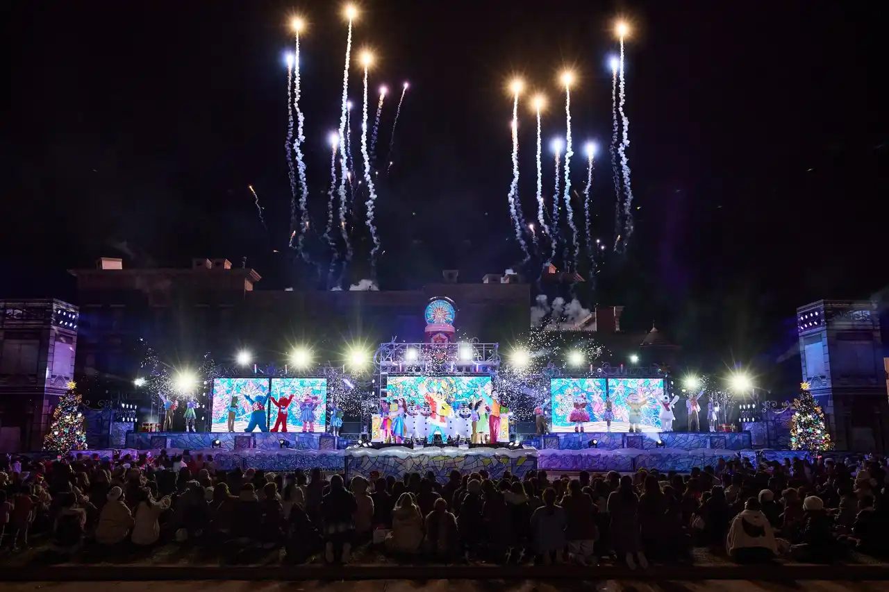 実力派シンガーやダンサーのクリスマス・ソングやダンス、巨大スクリーンの映像やキャンドル、ランタンの輝く光など華やかな演出でクリスマスを祝福する新ショーに、会場から拍手と歓声が沸き上がりました。ステージには、ハローキティ、スヌーピーとチャーリー・ブラウン、エルモやセサミストリートの仲間たちも次々と登場し、幸せなクリスマスの時間のために、本当に大切なものを気づかせてくれる心温まるストーリーを展開しました。クライマックスには、ゲストの皆さまもご自身のスマートフォンなどでライトを灯し、会場全体が溶け合うように光り輝きました。夜空に雪が舞い、華やかなパイロが打ち上がる光に包まれた至福の空間で、ゲストの皆さまは幸せなフィナーレの感動に浸りました。 |