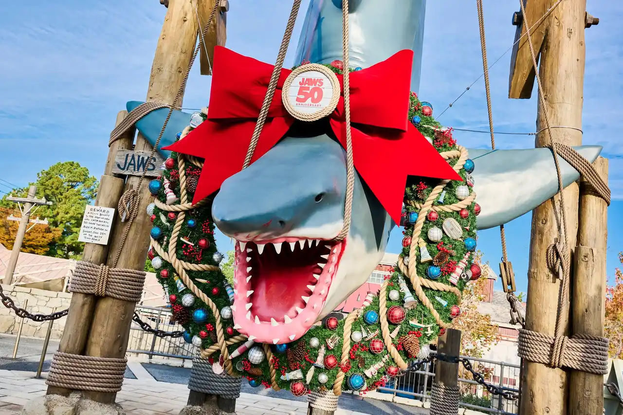 不朽の名作映画「ジョーズ」の日本での映画公開50周年(1975年12月6日初公開)を記念したアニバーサリー・イベント『ジョーズ・セレブレーション』【開催期間:11月19日(水)~2026年1月4日(日)】も、明日から開幕、パーク開業時から人気の『アミティ・ビレッジ』全体がお祝いムードにあふれます。50周年限定のクリスマス・リースが飾られたハンキング・シャークでの記念撮影や、アトラクション『ジョーズ』のボートツアーでの特別なアナウンス、テーマレストランのメニューリニューアルなど、パークだけの特別な「ジョーズ」の世界をゲストの皆さまは満喫しました。 |