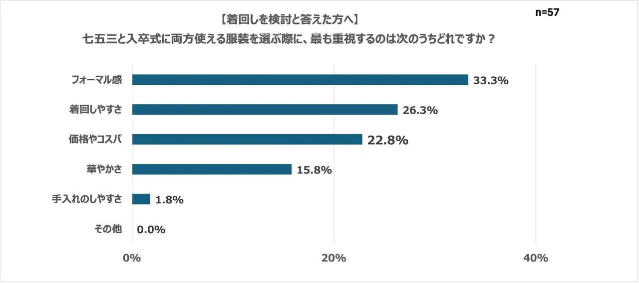 また、七五三用の服の着回しを検討していると答えた人の中でも、「七五三と入卒式に両方使える服装を選ぶ際に、最も重視するのは次のうちどれですか?」には「フォーマル感」が33.3%と最も多く、全体として「フォーマル感」が重視されていることがわかりました。 |
