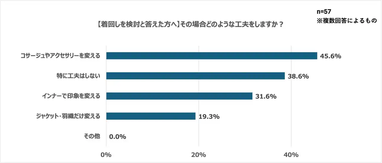 | 七五三用の服の着回しを検討していると答えた方に対し、「どのような工夫をしますか?」という質問には、「コサージュやアクセサリーを変える(45.6%)」、「インナーで印象を変える(31.6%)」、「ジャケット・羽織だけ変える(19.3%)」との回答があり、ワンポイントのアイテムを変え、一部は着回すことで印象を変えている人が多数いることがわかりました。 | |||||||||||||