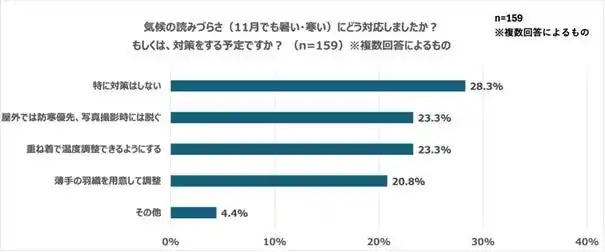 | 2025年は、「二季」というワードも流行語大賞にノミネート入りしましたが、「気候の読みづらさ(11月でも暑い・寒い)にどう対応しましたか?もしくは、対策をする予定ですか?」との設問に対しては、「屋外では防寒優先、写真撮影時には脱ぐ(23.3%)」、「重ね着で温度調節できるようにする(23.3%)」、「薄手の羽織を用意して調整(20.8%)」と、重ね着などで調整する人がほとんどで、「特に対策はしない」と回答した人は28.3%となり、調整も不要なシーズンレスアイテムへの需要も伺える結果となりました。 | |||||||||||||