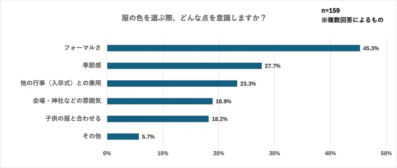 | 七五三イベントにおいて、「服の色を選ぶ際、どんな点を意識しますか?」の設問に対して、「フォーマルさ」と回答した人は45.3%で一番多い結果となりました。 | |||||||||||||