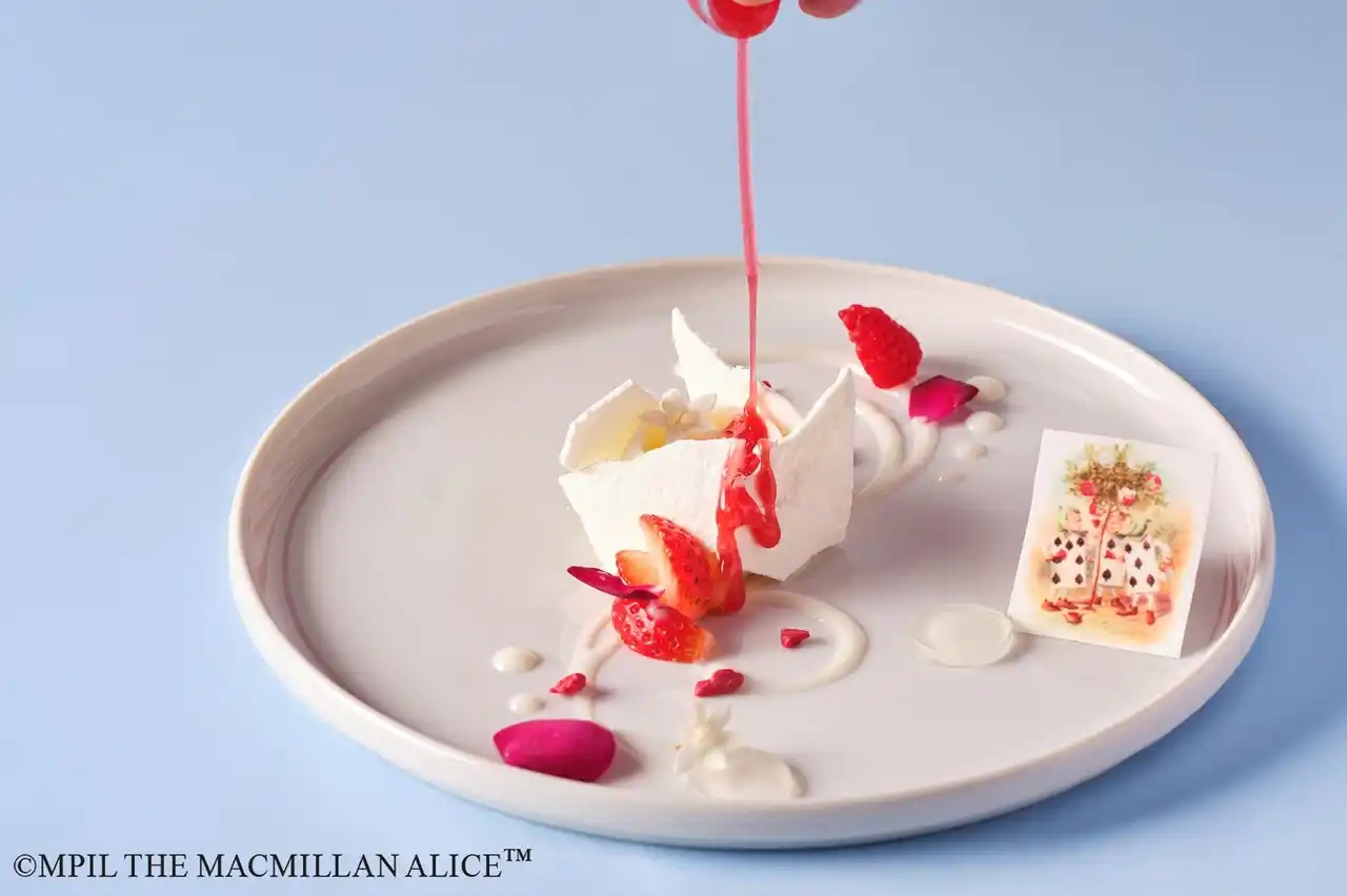 可憐な白い薔薇のムースを、ご自身で赤いラズベリーのソースやフレッシュいちご、ベリー、赤い薔薇で飾り付けて情熱的な赤い薔薇のお皿に変身させるスペシャルデザート「ペイント ザ ローズ」。トランプの園丁たちの作業になぞらえたマジックが目でも舌でも楽しめ、動画撮影も必至の一品です。 |