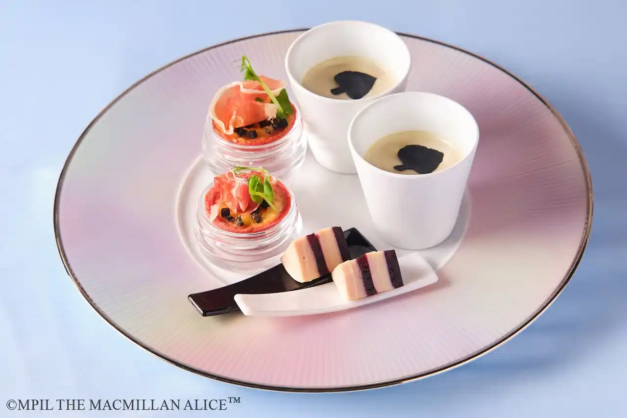 ゴルゴンゾーラの風味と生ハムの塩気がマッチした一口サイズのタルト、リンゴとブドウのフレーバーで仕上げたミルフィーユ、口どけ滑らかなカリフラワーのスープの3種。 |