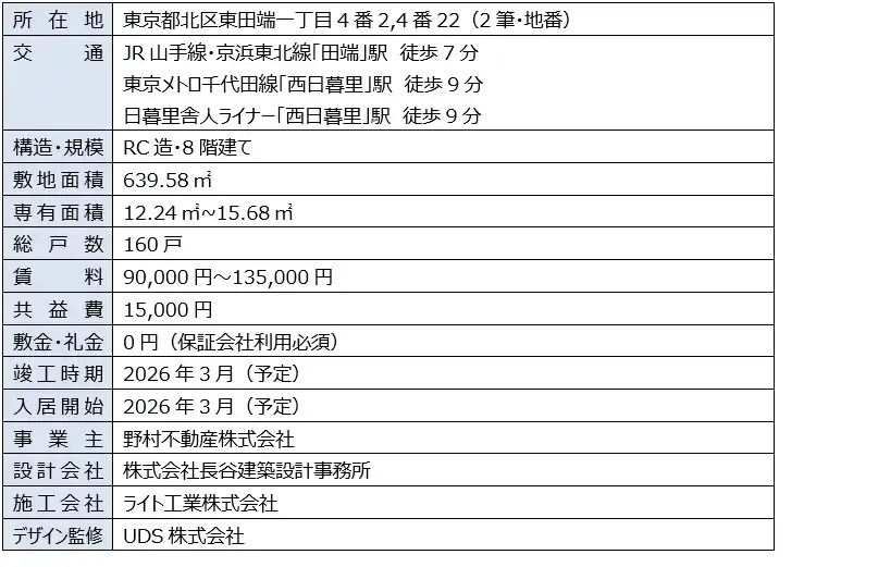 本物件は、山手線「田端」駅から徒歩7分の好立地、総戸数160戸という希少な大規模コリビング※3として誕生します。居室内には水回りを完備し、一人暮らしに配慮した生活導線やサービス設計に加え、上質で開放感ある2つの共用部を設けることで、都心で働く方々に快適な住環境を提供し、従来の入居課題の改善を図ります。 |
