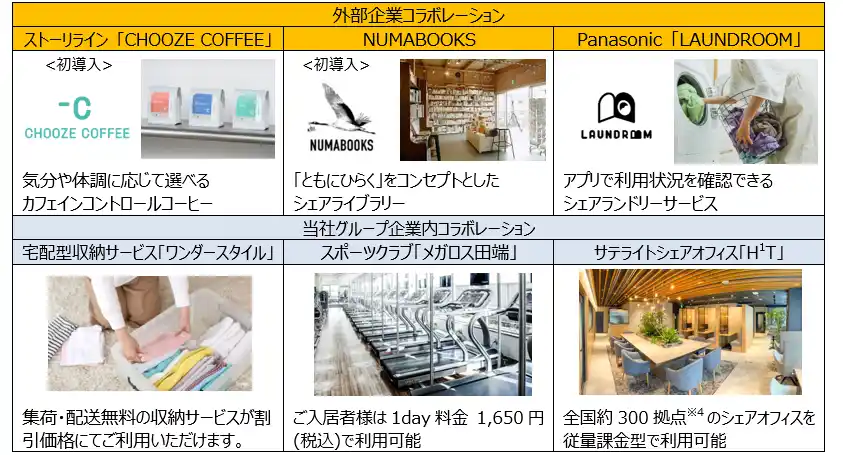 TOMORE では、入居者様の「職住快適性」と「交流快適性」を高めるべく、複数の外部パートナー様や当社グループ内企業とのサービス・コラボレーションを予定しています。 |