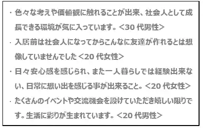 なお、第1 弾「TOMORE 品川中延」では、20~30 代・会社員の方を中心に80 戸超に入居いただいており、入居者様アンケートでは満足度80%超※2 の高い評価を得ています。現在、第3 弾の物件も開発中であり、今後も、東京23 区中心に積極的な物件開発を進めてまいります。 |