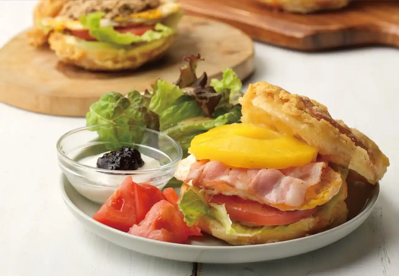 台湾朝食専門店「wanna manna(ワナマナ)」では、先行して販売している台湾ドーナツ「プレーン」「ミルク」に加え、新たに様々な具材を挟んだドーナツサンドを新発売いたします。 |