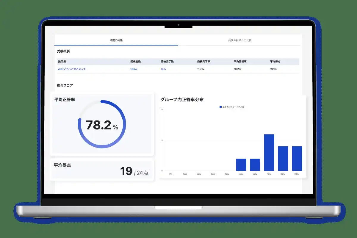 | 本アセスメントは、AIを自社の製品・サービスや業務プロセスに組み込み、DXを推進するための基礎的な知識を、総合的に測定する機能です。学習前後のAI知識の定着度を測定し、客観的な知識レベルを可視化することで個人の学習課題の発見・特定と、自発的な学習の動機づけを促進し、企業におけるAI活用の推進を支援します。 | |||||||