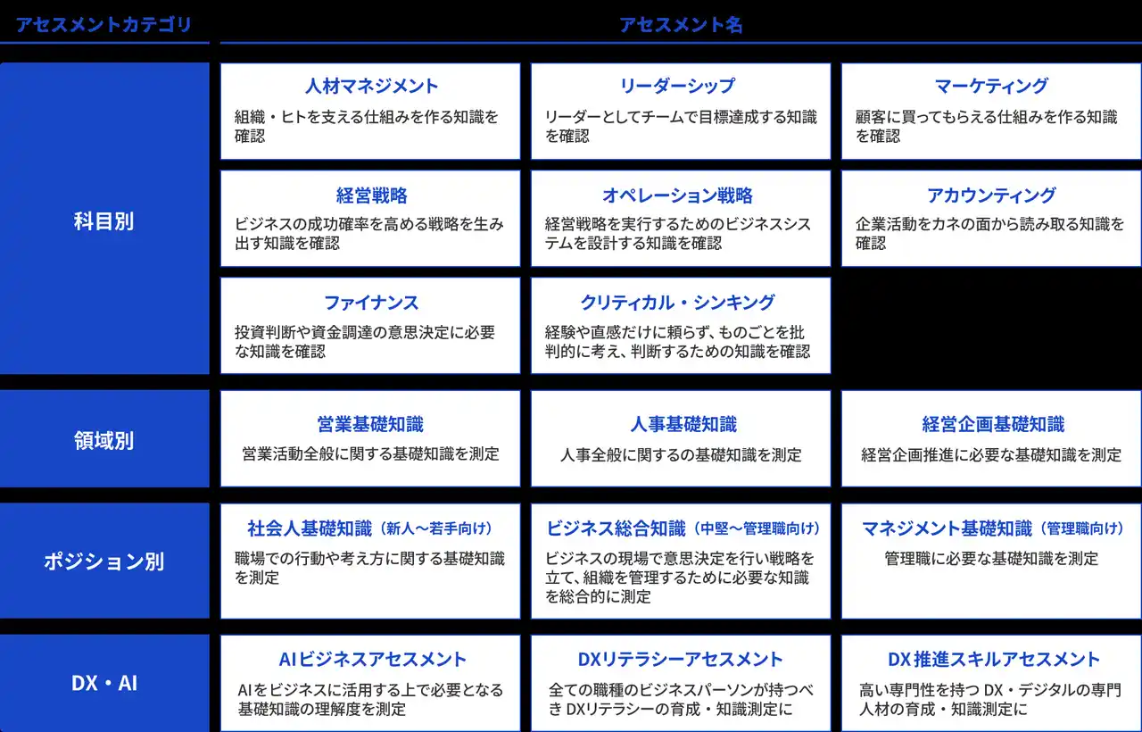 | 株式会社グロービス(本社:東京都千代田区、代表取締役:堀義人、以下「グロービス」)は、定額制動画学習サービス「GLOBIS 学び放題」において、法人顧客向けに、「AIビジネスアセスメント」の提供を開始しました。本アセスメントは、幅広いビジネスパーソンの学習をサポートしてきた中で得た知見を活かして開発され、AIツールに関する知識・用語理解からガバナンスなどのマネジメント領域まで、AI活用に必要な知識の総合的な測定を可能にします。 | |||||||