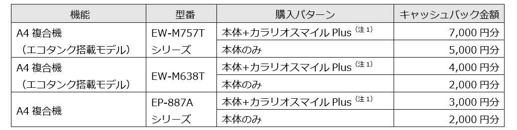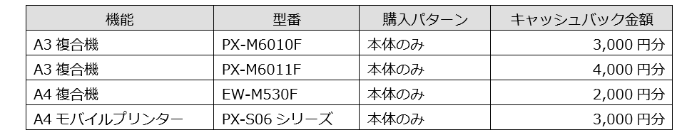 | ・キャンペーン対象商品とキャッシュバック金額 | |||