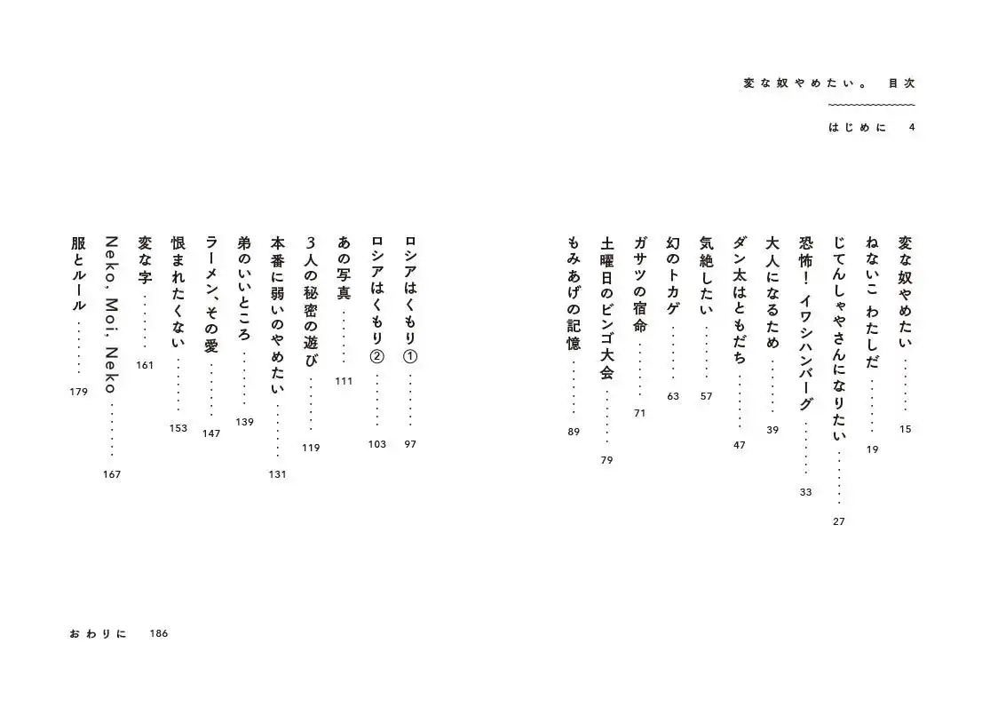 ”変な奴”になったルーツを語る「変な奴やめたい」。戦隊ヒーローに憧れ、ことあるごとに気絶を試みる「気絶したい」。大事なところでどうしても失敗してしまう自分を書いた「本番に弱いにやめたい」。自分は大事な思い出としてずっと覚えているのに、友人はそのことをすっかり忘れている悲しさを書いた「3人の秘密の遊び」。飼い猫への信頼と愛情が詰め込まれ、涙なしでは読めない「Neko, Moi, Neko」。”変な奴”である自分を受けいれた「服とルール」……。 |