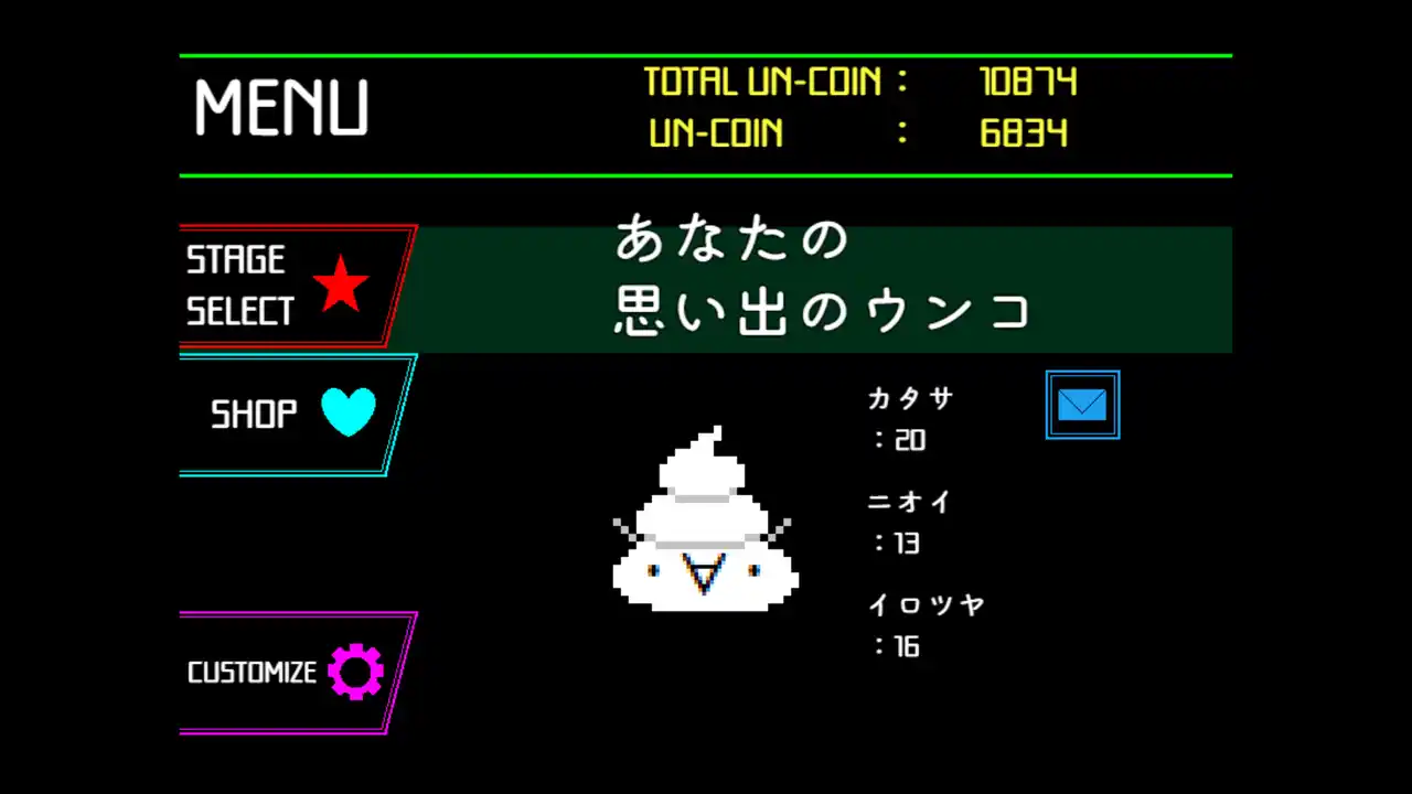 ステージで入手できる「UN-COIN」を消費して、ウンコの見た目をカスタマイズできるガチャを回したり、さらなる高難度ステージを解放したりすることができます。 |