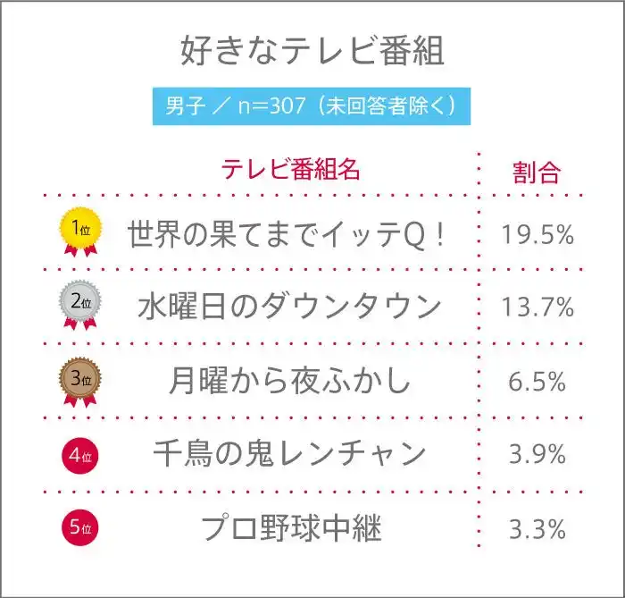 | 男女共通の1位は、日本テレビ系列で放送中の『世界の果てまでイッテQ!』。現在の高校3年生が生まれた2007年に放送が開始された番組で、長く愛されている番組であることがわかりました。 | |||