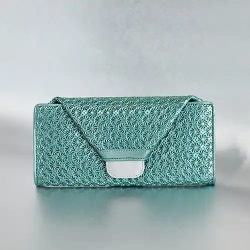 | 「GIRASOLE(ジラソーレ)」シリーズは、メタリック加工をした牛革に、型押しと型抜きを同時に施した、一見金属のように見える連続的な模様を出したデザインです。 | |||||||||||||||||||