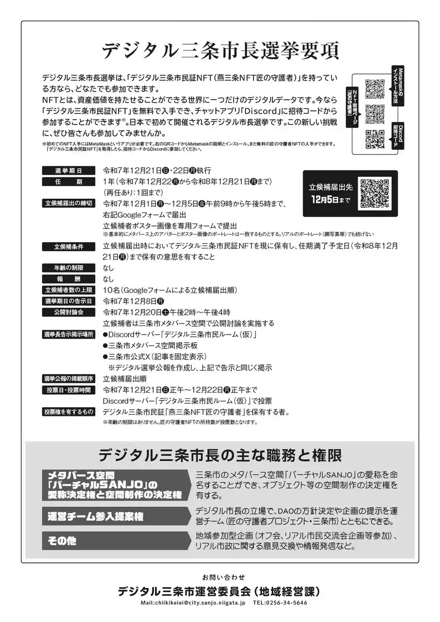 | 新潟県三条市のデジタル空間において、全国初となるデジタル市長を決める「デジタル三条市長選挙」を開催します。 | |||||||||