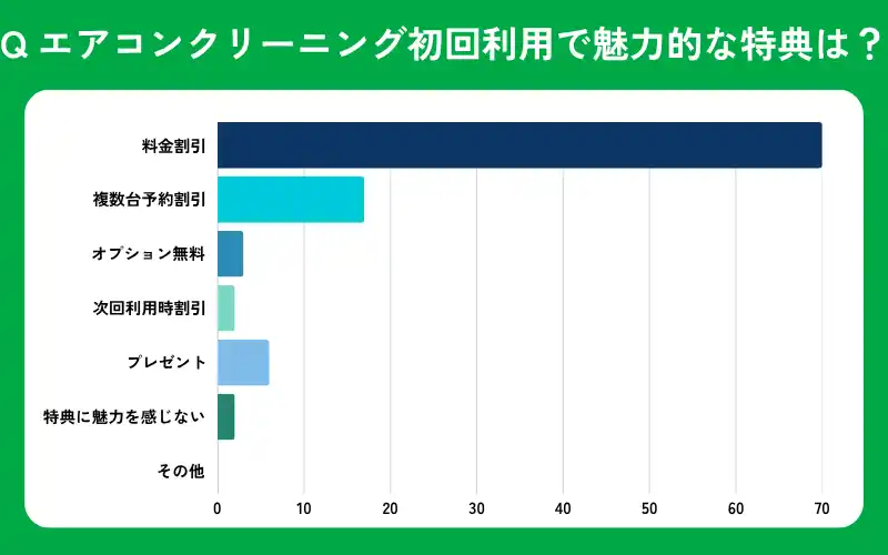 | エアコンクリーニングを初めて利用する際、最も魅力的だと思う特典はどれですか? | ||||||||||||||||