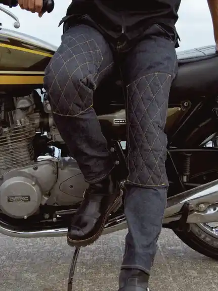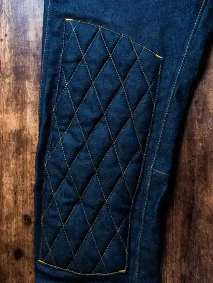 特徴的なダイヤ柄は10mm厚ウレタン+別布+デニム構造で柔軟かつ保護性能を両立しています。 |