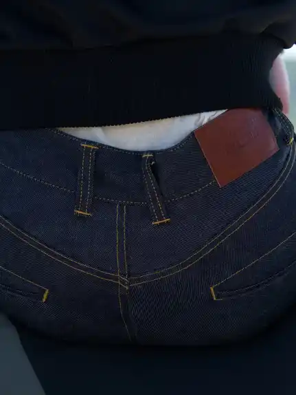 デニムには珍しい袋ポケット。最深部で約21cmと深めに設計。中の布(スレキ)がお尻に追従し長時間ライドになるほど効果を発揮。 |