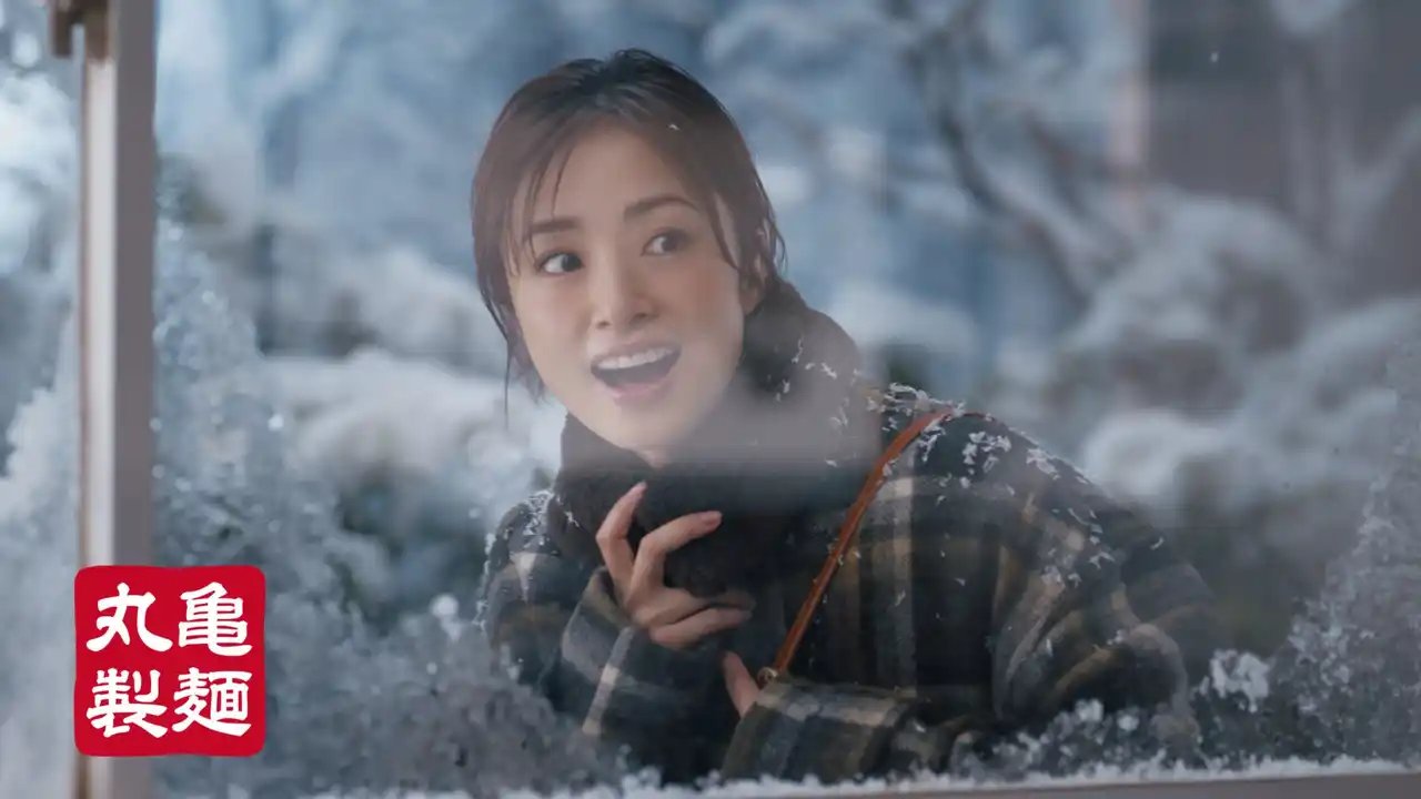 今回のTVCMは、雪が降りしきる寒い日、温かい湯気の立つ丸亀製麺の店内を上戸さんが窓越しに覗き込むシーンから始まります。 |