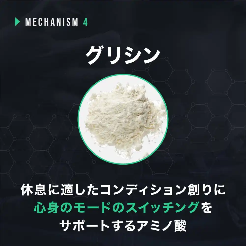 | グリシンは休息と相性のよいはたらきが確認されているアミノ酸の一種。 | |||