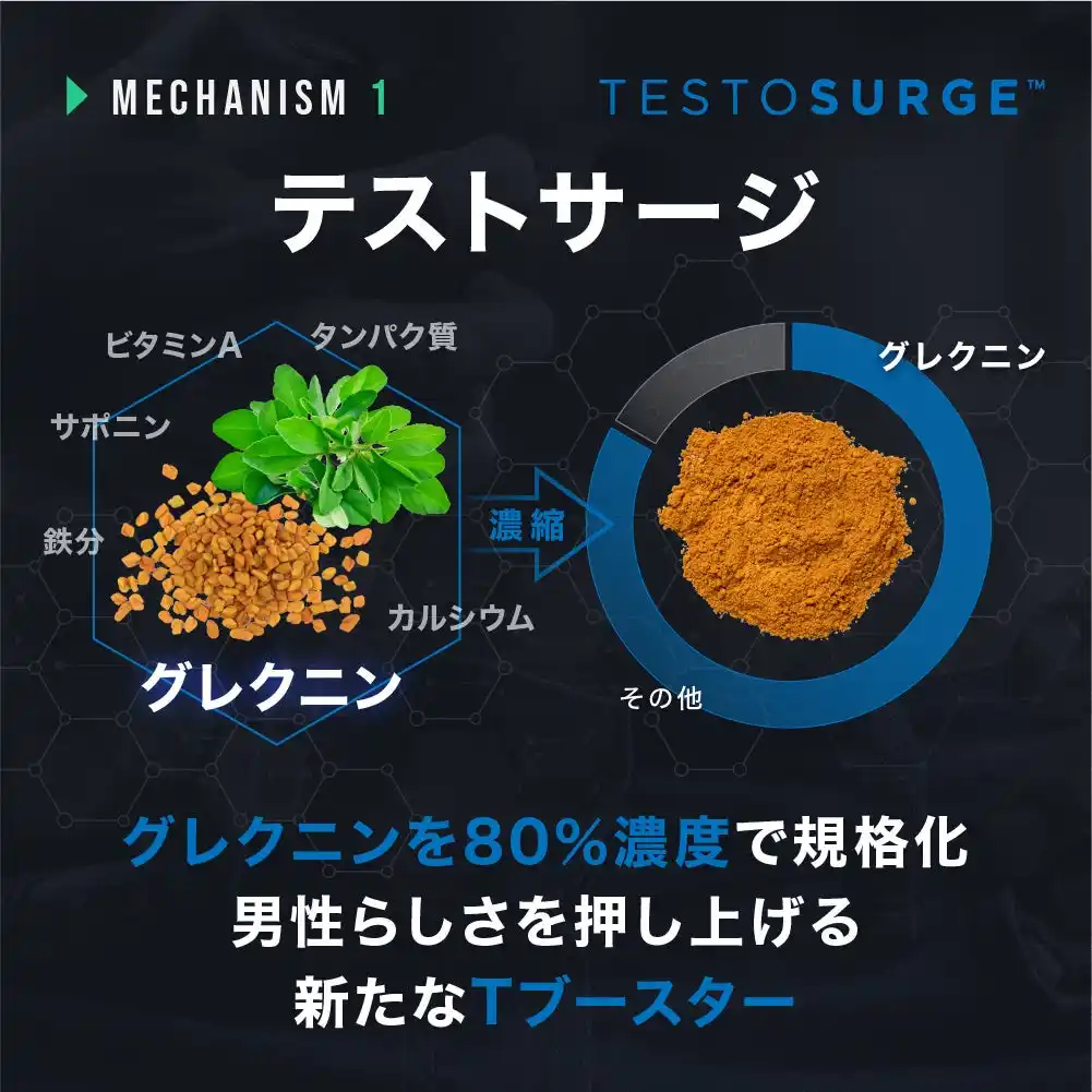 | テストサージはカレーのスパイスとしても知られるフェヌグリークの種子から、グレクニンと呼ばれる特殊な配糖体のグループを80%濃度で抽出した素材です。 | |||