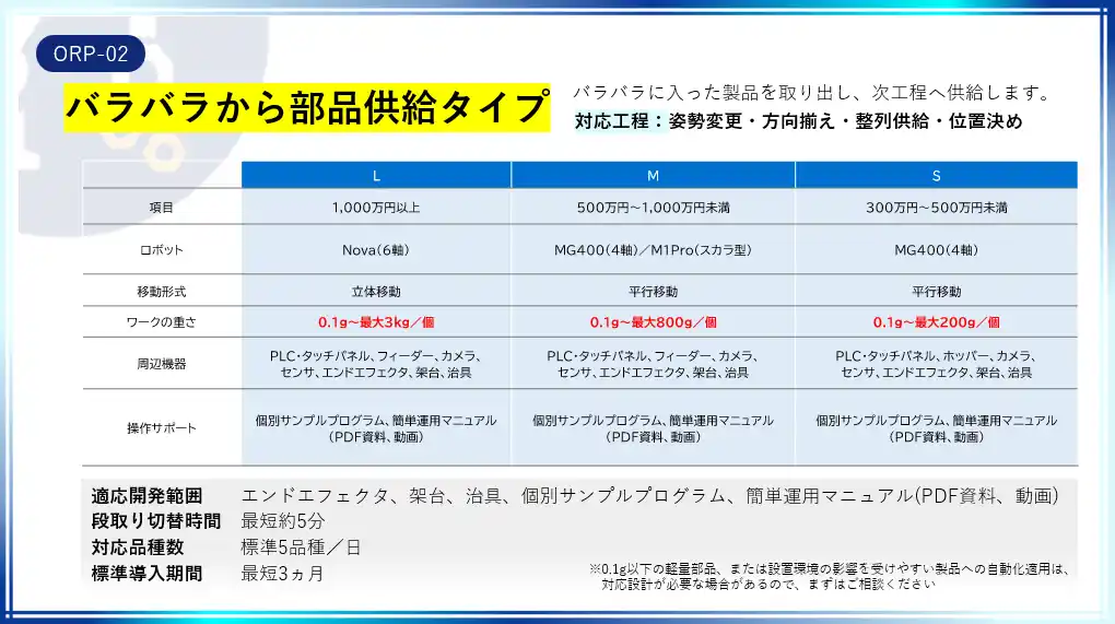 | 本サービスは、「一日5品種を標準対応」、「導入後、即工程生産能力を10%向上」、<機器・設計・開発・設置>の費用を“ぜんぶ込み”にした「圧倒的な低価格 (300万円から)」、導入前の<調査・構想コスト>を削減し「導入企業のプロジェクト負荷低減」」を叶える、ロボット・周辺機器・操作手順を備えた実証済みのオペレーション・ロボット・パッケージです。 | ||||||||||||||||