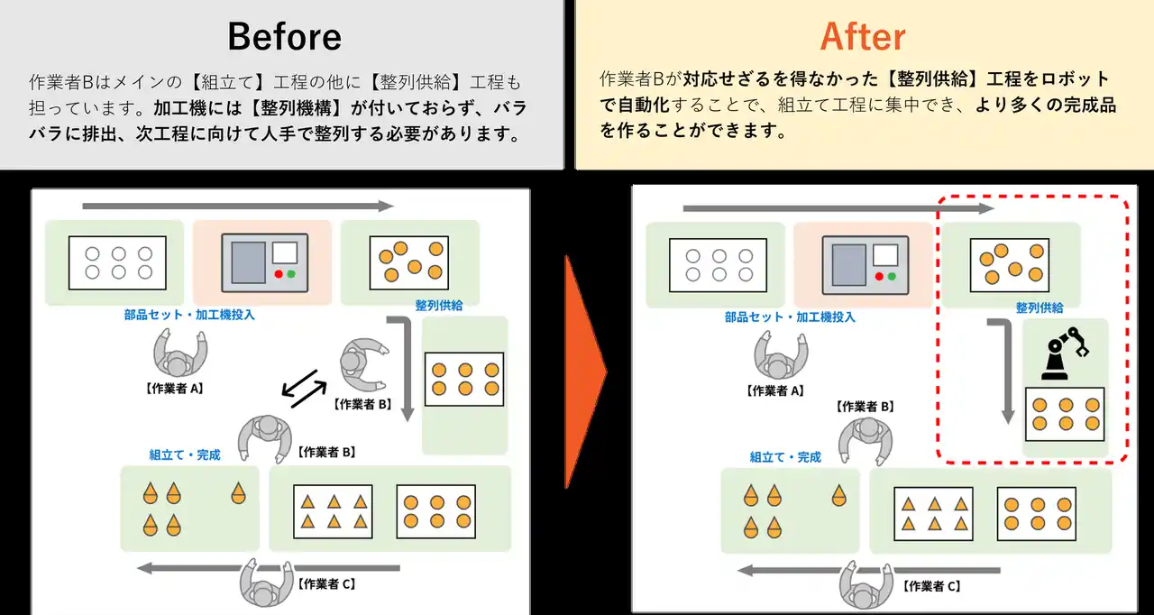 | 「姿勢変更」「方向揃え」「整列供給」「位置決め」「目視検査」などの、特に人手からの解放が急務とされる5つの工程を容易に自動化することで、作業者がよりコア工程に集中できます。これまで人の手で培ってきた中堅製造業の【製造技術】【固有の強み】を維持したまま、工場全体の生産能力向上を支援します。 | ||||||||||||||||
