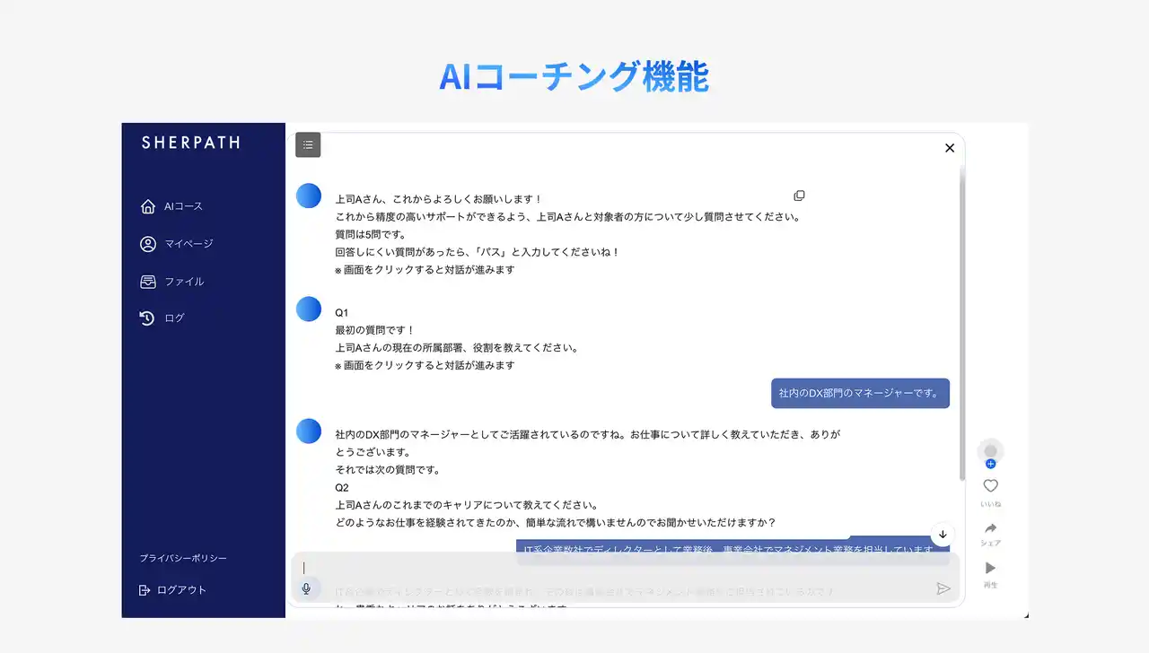 学びを実践しようとする時に生まれる疑問や悩みに、研修内容とその理論を学習したシェルパが、具体的にアドバイスを行うのがAIメンター機能。 コーチング内容と受講者のプロファイルも学習しているため、個に最適化したサポートが可能です。 |