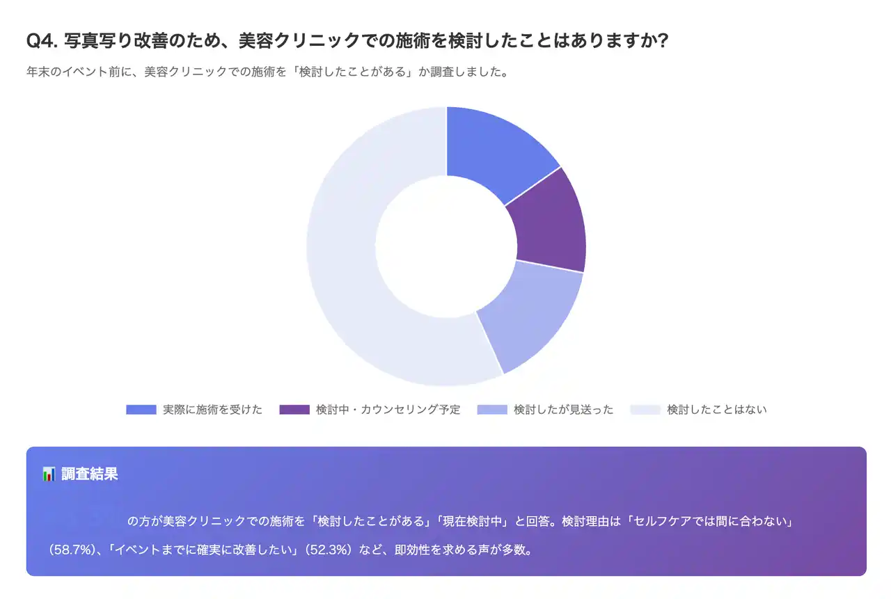 | その結果、43.3%の方が「検討したことがある」「現在検討中」と回答し、写真写りを意識したタイミングで美容医療への関心が高まる傾向が明らかになりました。 | |||||||||||||||||||||