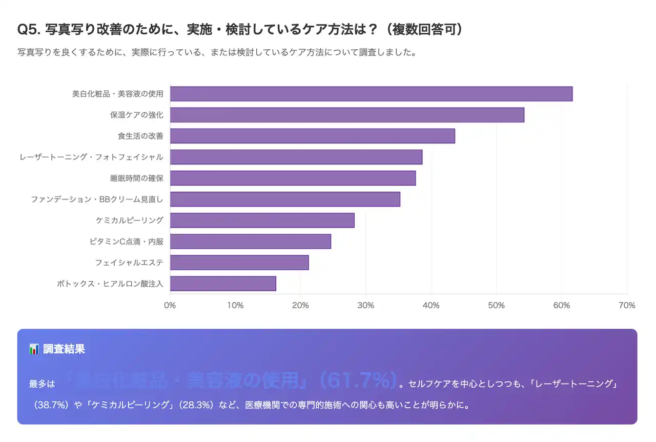 | その結果、「美白化粧品・美容液の使用」が61.7%で最も多く、次いで「保湿ケアの強化」(54.3%)、「レーザートーニングやフォトフェイシャル」(38.7%)という結果になりました。 | |||||||||||||||||||||