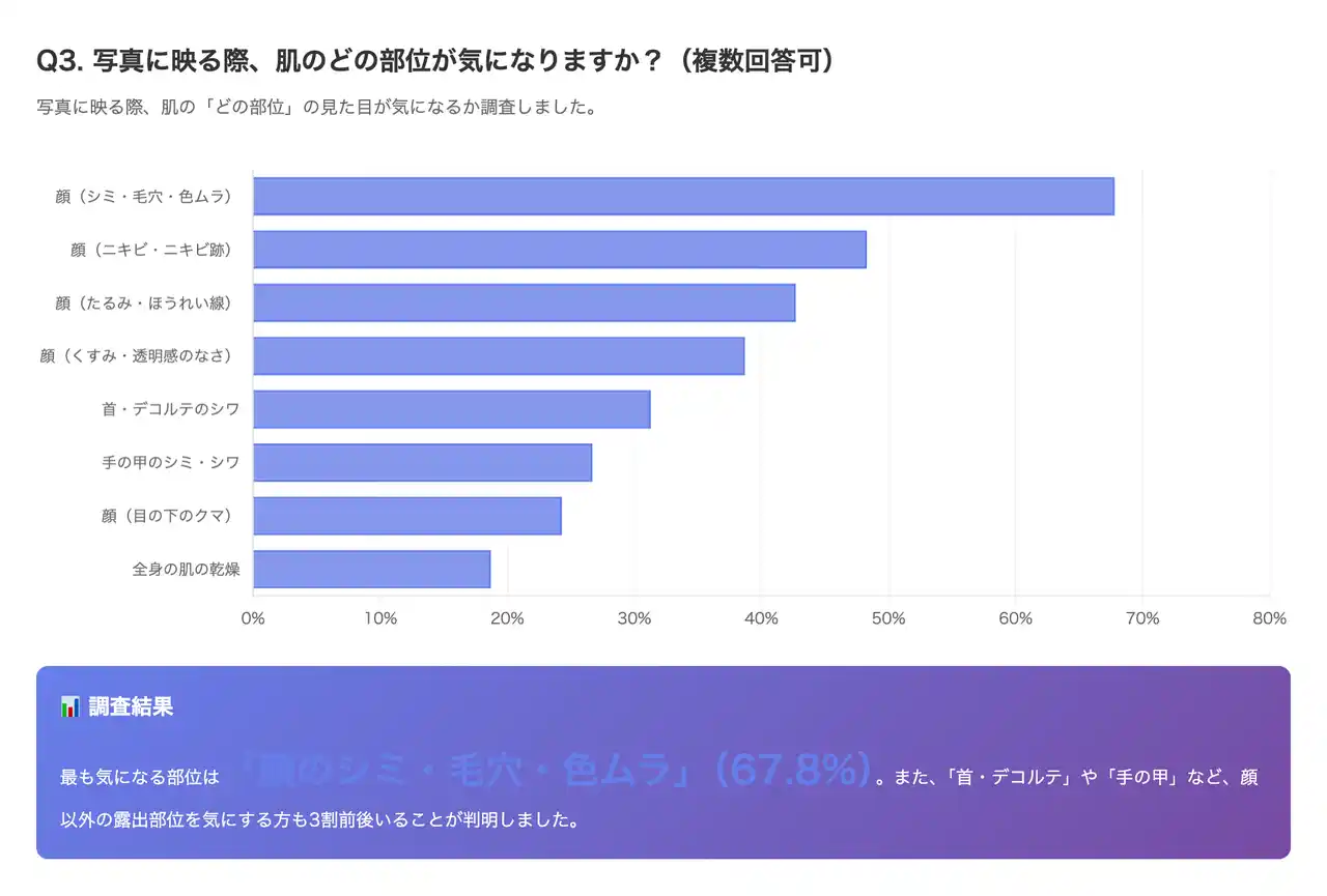| 調査では『首・デコルテ』や『手の甲』を気にする方も多くいらっしゃいました。顔だけでなく、露出する部位全体のケアを考えることで、より美しい写真映えが実現します。 | |||||||||||||||||||||