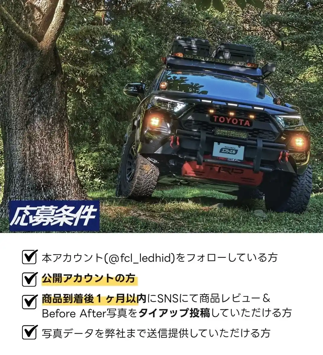 | 本企画は、2025年の1年間、エフシーエルをご愛顧いただいたユーザーの皆様への感謝と、これからの冬のドライブシーズンに向けて、より多くの方に「見やすく、安全なライト」を体験していただきたいという想いから実施するものです。 | ||||||||||