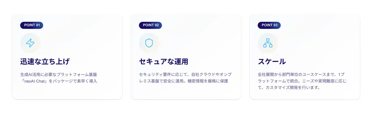 迅速な立ち上げ:「neoAI Chat for 製造業」のパッケージで素早く導入。製造業特化のアシスタントテンプレートで設計・品質・生産管理・調達などの主要部門へ短期間で展開。 |