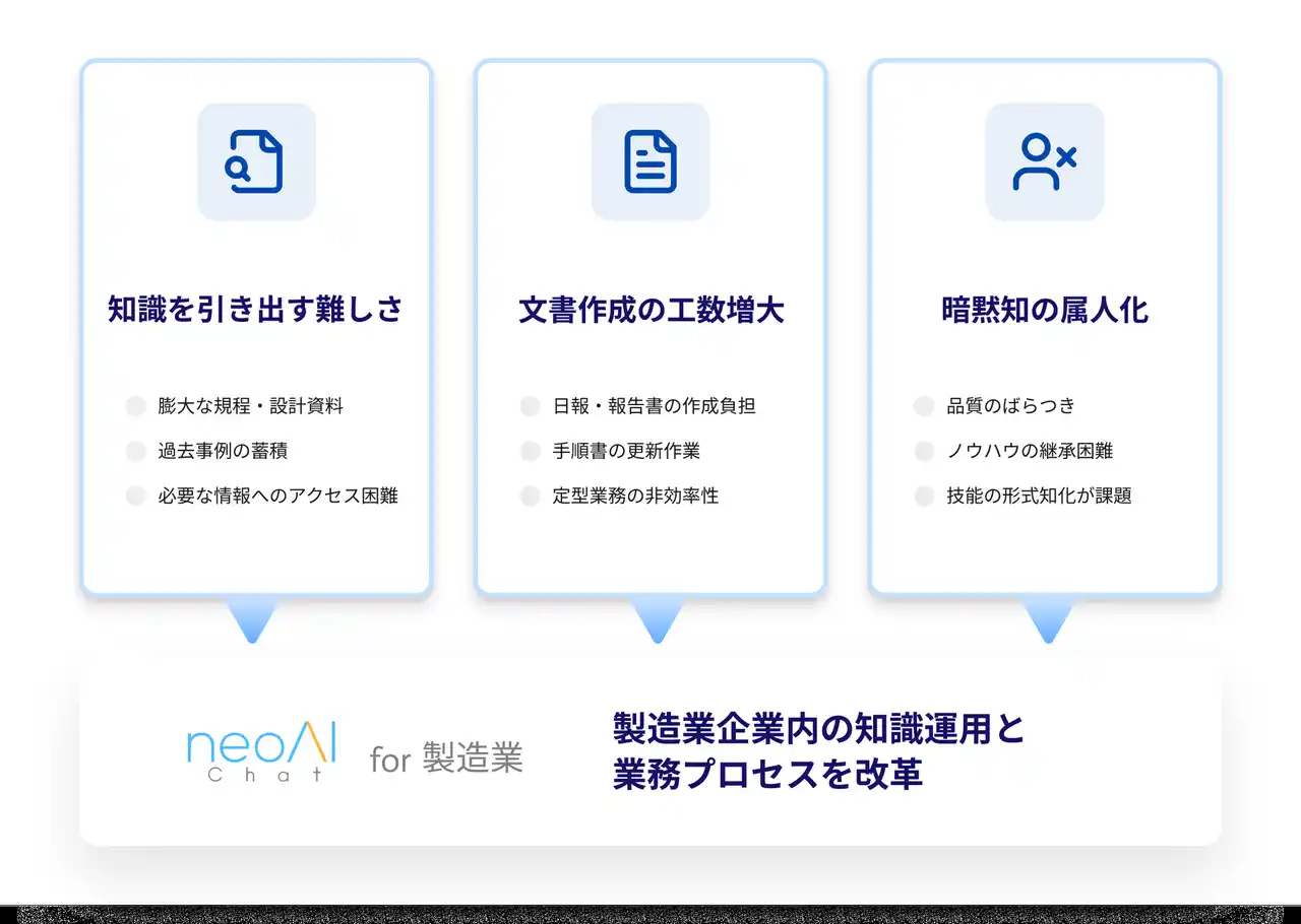 これらの現状の中で、neoAIは、生成AIをあんしん・安全かつ実務的に活用できるプラットフォーム「neoAI Chat for 製造業」により、製造業企業内の知識運用と業務プロセスを改革します。 |