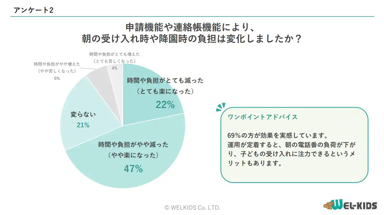 本調査は、園のICT導入による業務負担軽減の効果を明らかにし、より満足度の高いサービス提供を目指すことを目的としています。 |