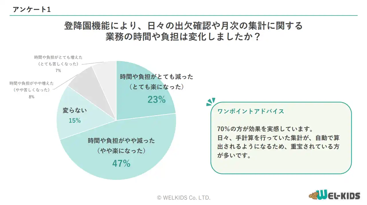 この結果により、登降園機能の導入による業務負担の軽減が広く実感されていることが分かりました。特に、従来は手作業で行っていた記録作業・集計作業が自動化されたことで、日々の業務がよりスムーズになったと推察されます。 |