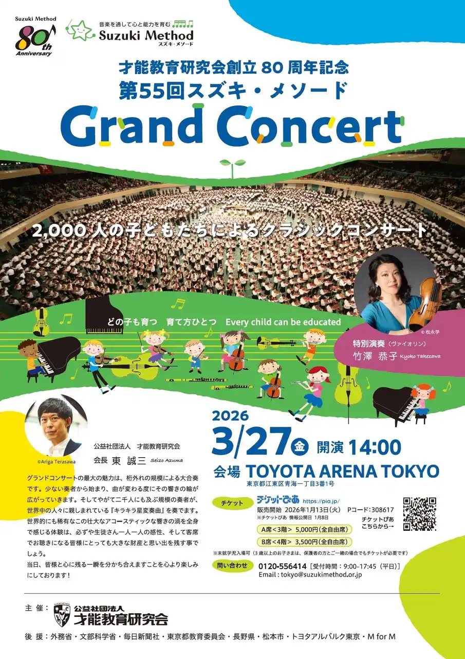 | 世界各国でスズキ・メソード音楽教室を展開する公益社団法人才能教育研究会(理事長:早野龍五、以下「スズキ・メソード」および「スズキ」)は、2026年に創立80周年を迎えます。 | ||||||||||||||