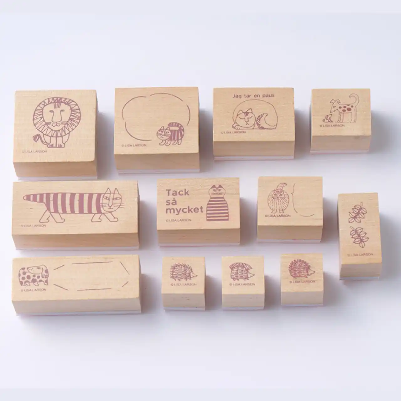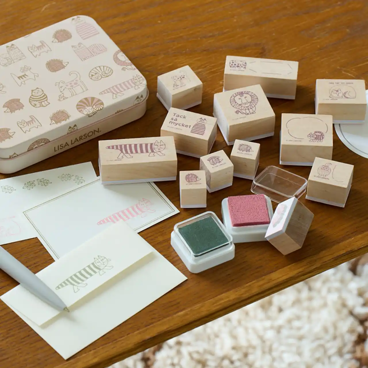 「マイキー」をはじめ、リサ・ラーソンのスケッチから生まれたユーモアたっぷりの仲間たちの木製スタンプセットです。ピンクとグリーンの2色のインクパッド、スタンプ12点が缶ケースに収められています。