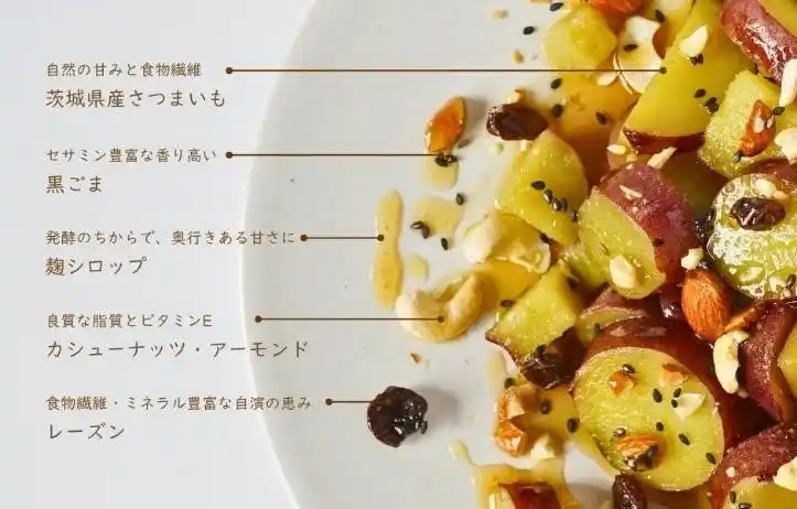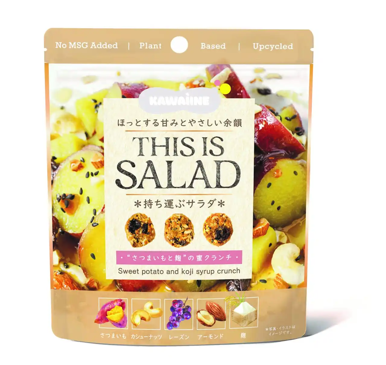 “野菜を補う”新習慣「THIS IS SALAD」に加わった新フレーバーは、割れや不揃いなどの規格外品のさつまいもをたっぷり使用し、レーズンやナッツを加え、日本酒製造副産物のお米をアップサイクルした米麹発酵甘味料でまとめたクランチスナックです。自然の甘味とザクザク食感をお楽しみください。 |