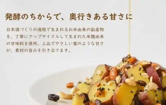 株式会社オリゼと協業し、日本酒製造時の副産物のお米をアップサイクルした、米麹由来の発酵甘味料を使用。植物由来100%で、砂糖に代わる“やさしい甘み”と“発酵による旨み”を引き出しています。 |