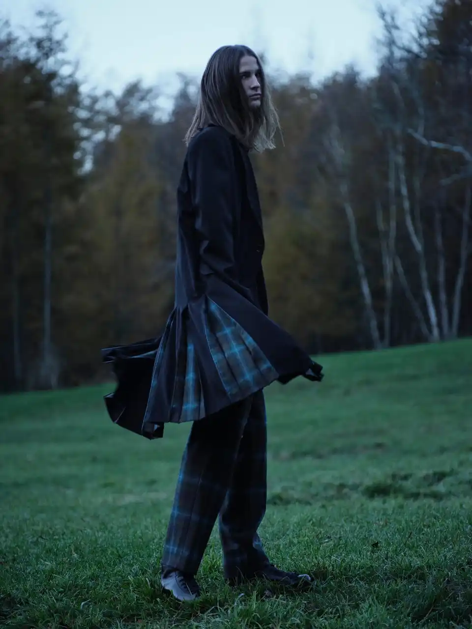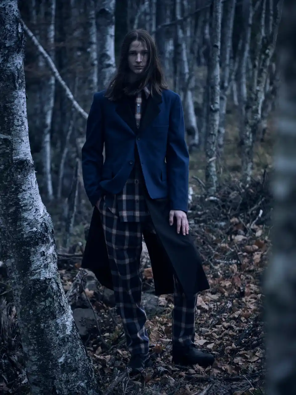 本コレクションでは、Yohji Yamamoto POUR HOMME 2008‑09AWランウェイに登場したチェック柄アイテムを再構築し、ジャケット、シャツ、パンツを展開します。ブランケットのように贅沢にチェック生地を用いた分量感のあるストールジャケットや、レイヤード構造のジャケット、プリーツ部分にチェック生地を縫い込んだジャケットなど、ロング丈のジャケットに細身シルエットのパンツを組み合わせています。希少なUSメイドのペンドルトンチェック生地のオーセンティックで温かみのある表情を、ヨウジヤマモトならではのシルエットやデザインと組み合わせ、新たなスタイルとして提示します。 |