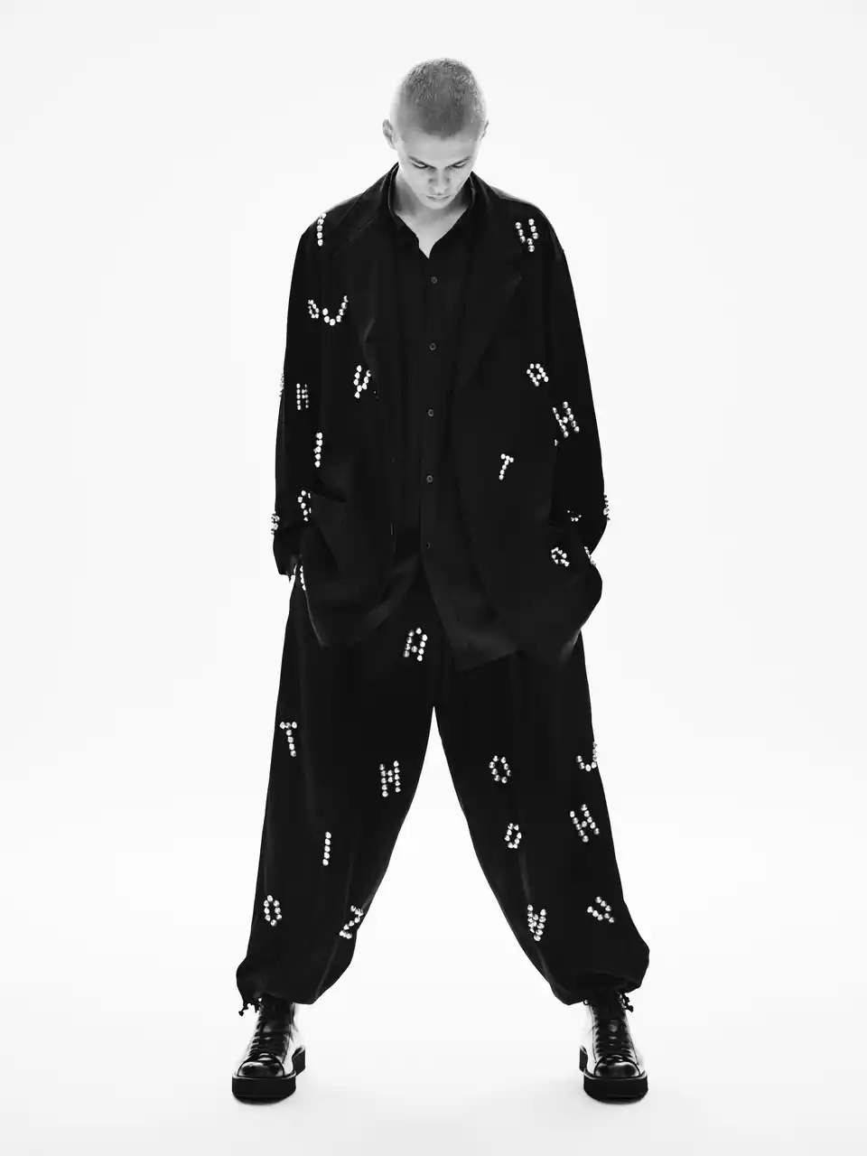 本コレクションでは、トラッカー型デニムジャケットに手作業によるスタッズワークで“YOHJI”の文字を表現。また、ウールギャバジン素材のジャケットとパンツによるセットアップにもHTCの装飾加工を施し、1点のみのエクスクルーシブアイテムとして制作しています。熟練職人の手作業によって生まれる個体差や温かみのある表情が魅力です。また、スタッズショルダーバッグ、スタッズベルト、スタッズブレスレットなどのアクセサリーも展開しており、ヨウジヤマモトのデザインとHTCの職人技が融合した特別なラインアップとなっています。 |