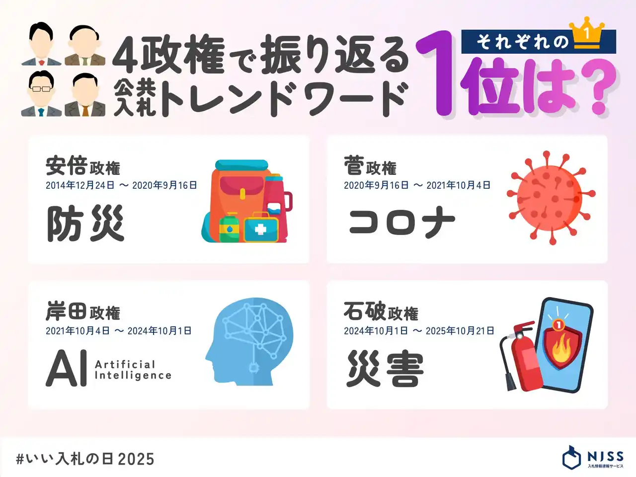 制定から 7 年目を迎える今年の「いい入札の日」は、新政権誕生という社会的な節目を受け、「NJSS」に蓄積された入札・落札データをもとに、安倍(※1)・菅・岸田・石破の 4 政権下における公共入札の動向を比較し、それぞれの政策方針がどのように公共入札市場へ影響を与えてきたかを振り返りました。また、10 月に発足した高市政権を新たな起点として、今後どのような案件が公共入札で注目されていくのかを予測します。 |