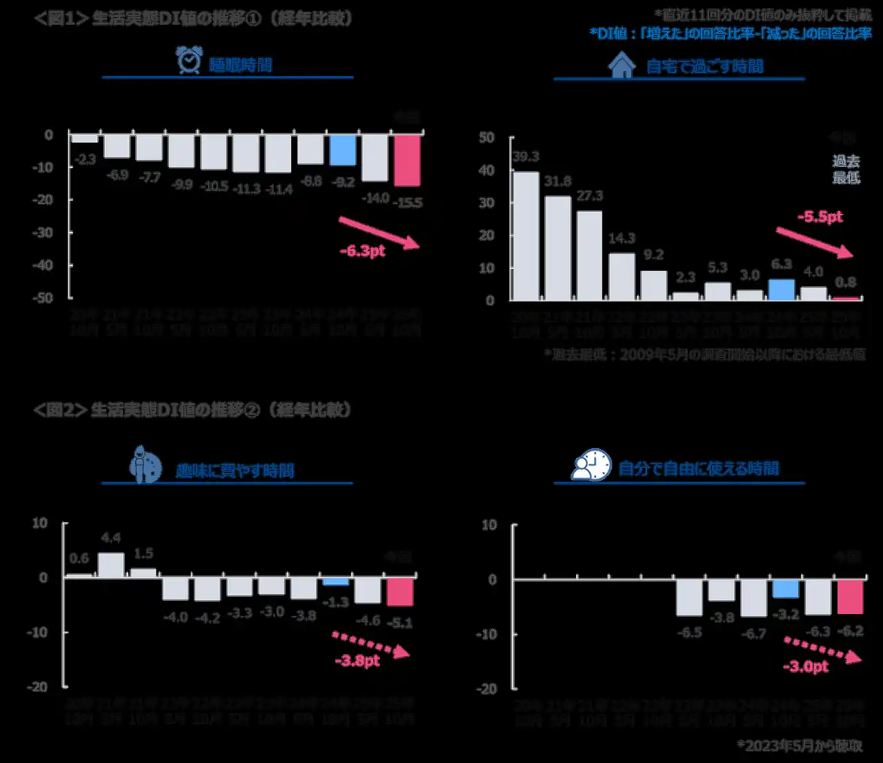 生活実態DI値「睡眠時間」と「自宅で過ごす時間」は、前年同期より6ptの低下であり、「自宅で過ごす時間」は、2009年5月の調査以降最も低い数値となった。「趣味に費やす時間」は4pt、「自分で自由に使える時間」は3ptと前年同期より低下した。それ以外の生活実態DI値(労働時間、給与所得、預貯金、食費、おこづかい)は前年同期と大きな動きはなかった。生活実態で上昇したDI値はなく、単に安らぎの時間が減っていると推察される。<図1、2> |
