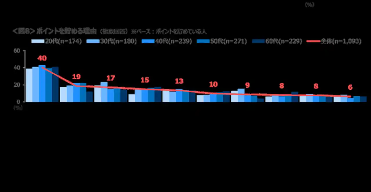 ポイ活理由は、「日々の生活費を節約したい」が40%と突出して高く、年代による差はない。<図8> |