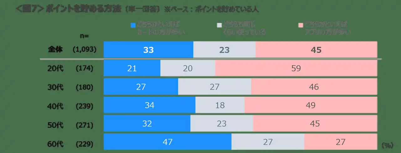 ポイントを貯めている人に何で貯めているかを確認した。アプリ派は45%、カード派は33%。20~50代はアプリ派で、60代になるとカード派が主流となる。<図7> |