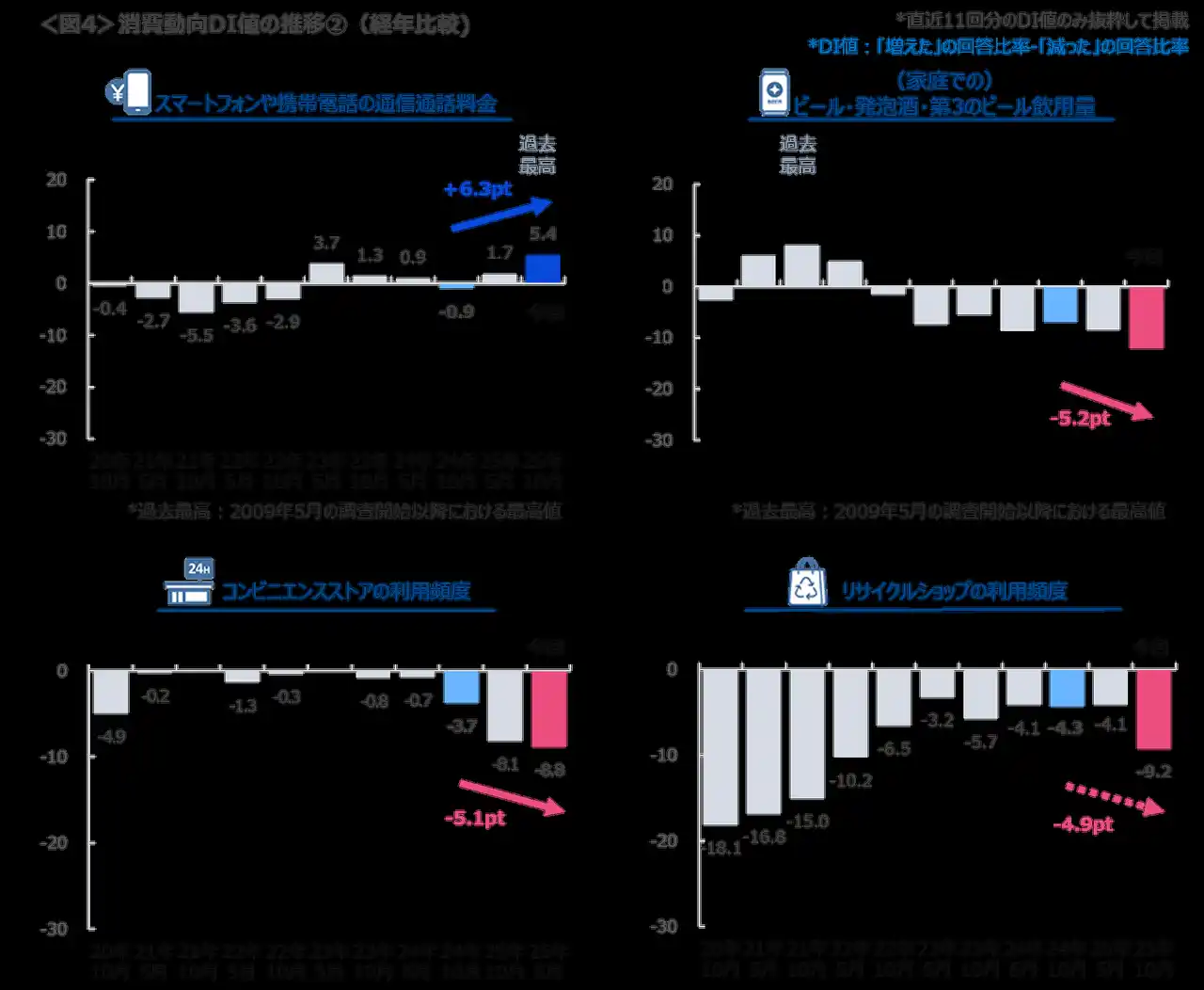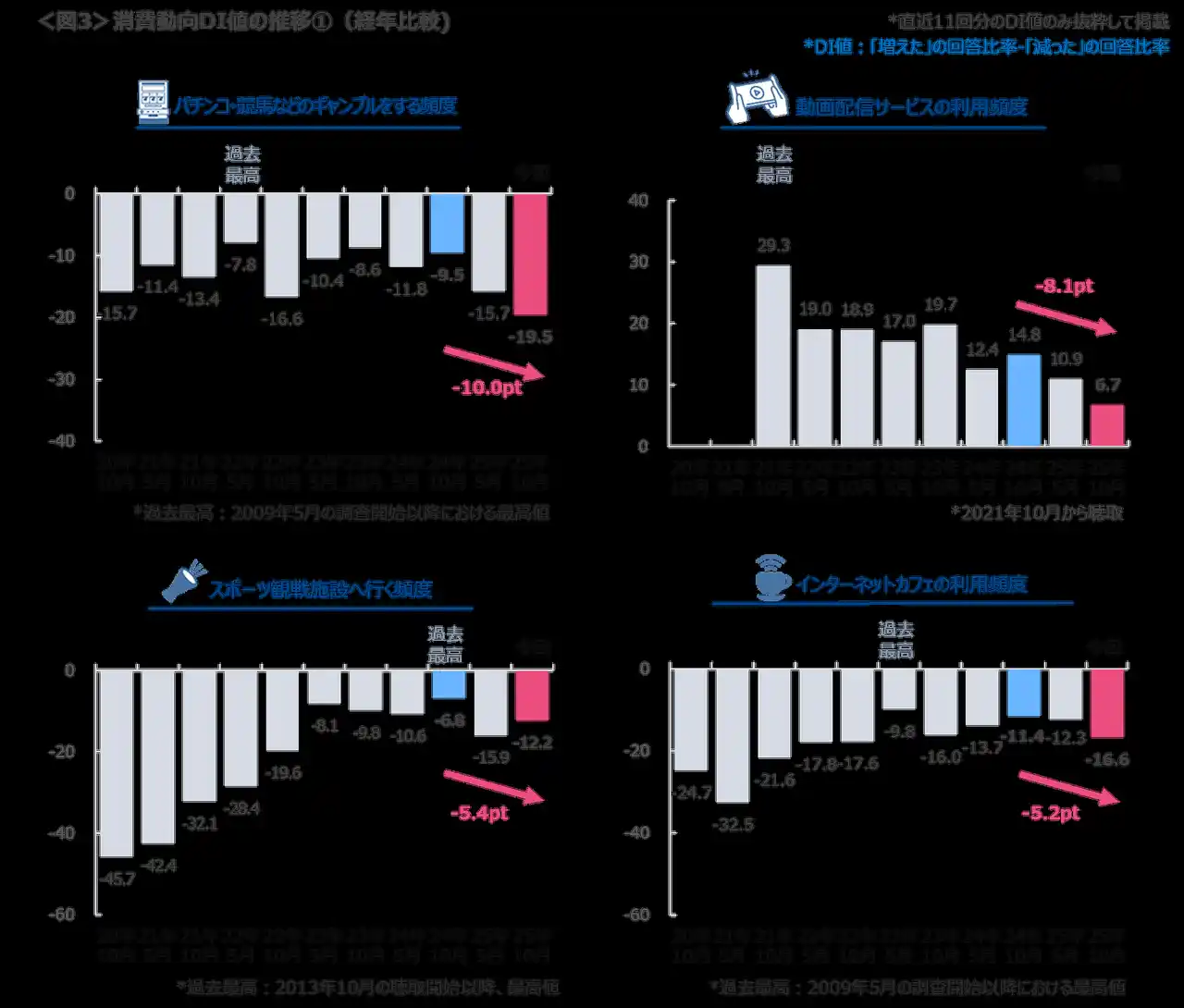 消費動向については、「パチンコ・競馬などギャンブルをする頻度」「動画配信サービスの利用頻度」「スポーツ観戦施設へ行く頻度」「インターネットカフェの利用頻度」といった娯楽や趣味関連の項目が5~10pの低下。「家庭でのビール類の飲用量」「コンビニエンスストアの利用頻度」「リサイクルショップの利用頻度」が5ptの低下。一方「スマートフォンや携帯電話の通信通話料金」は6pt上昇した。本調査で聴取しているその他の消費動向の項目をみると、ややプラスとなったのは「保険料」「クレジットカードの利用金額」のみで、多くは前年同期に比べマイナスや横ばいの傾向。止まらない物価高から依然として消費を抑えようとしている様子がうかがえる。<図3、4> |