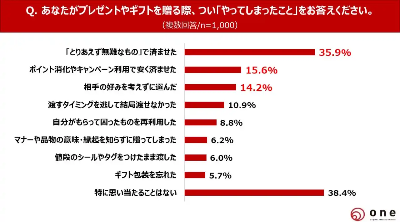 | プレゼントやギフトを贈る際に、つい「やってしまったこと」TOP3は、1位「『とりあえず無難なもの』で済ませた」35.9%、2位「ポイント消化やキャンペーン利用で安く済ませた」15.6%、3位「相手の好みを考えずに選んだ」14.2%でした。品物を選ぶ時間がなかったり、考えすぎてわからなくなったりして“無難”に済ませてしまうことはプレゼント・ギフト選びのあるあるではないでしょうか。ギフト購入にポイントやキャンペーンを利用することに後ろめたさを感じる方もいそうですが、物価が高騰している昨今は、合理的な行動といえるのかもしれません。 | ||||||||||||