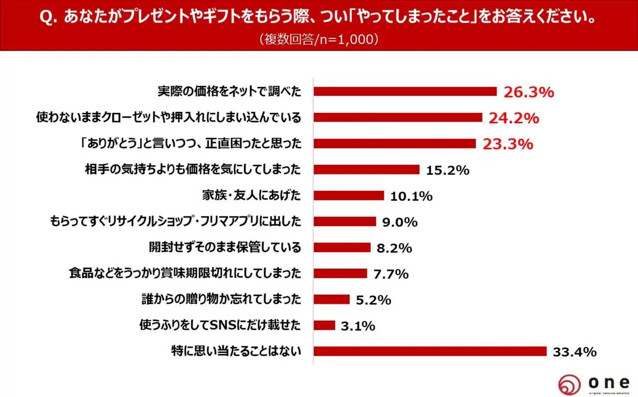 | プレゼントやギフトをもらう際、つい「やってしまったこと」TOP3は、1位「実際の価格をネットで調べた」26.3%、2位「使わないままクローゼットや押入れにしまい込んでいる」24.2%、3位「『ありがとう』と言いつつ、正直困ったと思った」23.3%でした。4人に1人以上が、もらった品物の価格を調べたことがあると判明しました。 | ||||||||||||